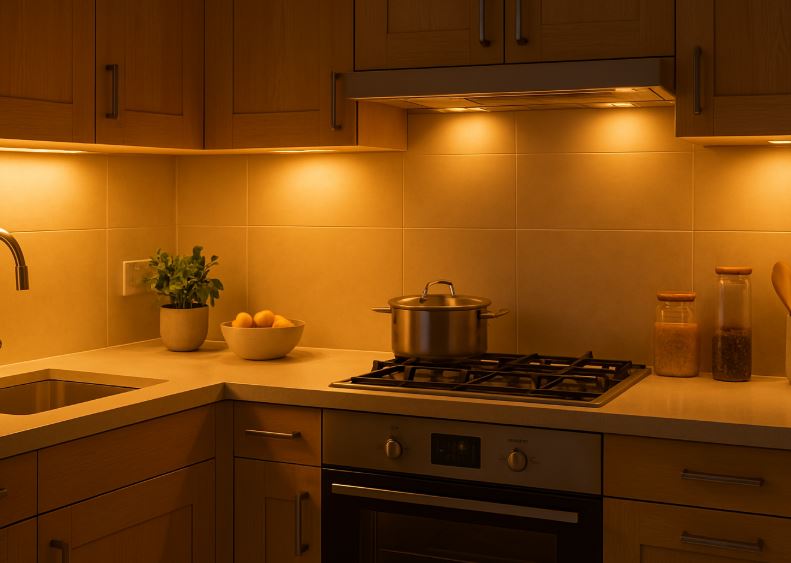 Dans une cuisine ouverte, combinez luminaires cuivrés et éclairage LED pour une ambiance conviviale. Le contraste avec les matières froides crée un équilibre idéal. Conseils d’éclairage pour votre cuisine.