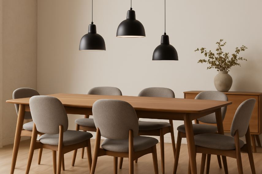 Les luminaires suspendus à différents niveaux au-dessus de la table permettent de délimiter visuellement l’espace repas et d’offrir une ambiance chaleureuse. Voir plus d’idées pour bien éclairer votre salle à manger.